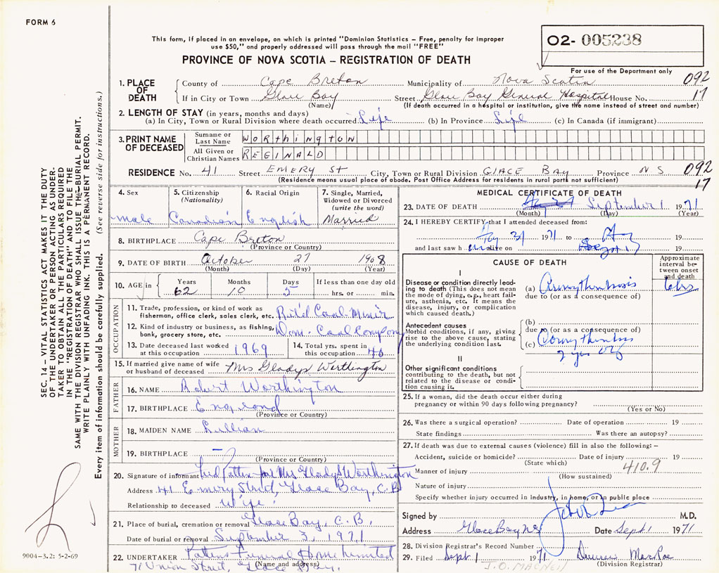 PROVINCE OF NOVA SCOTIA — REGISTRATION OF DEATH
