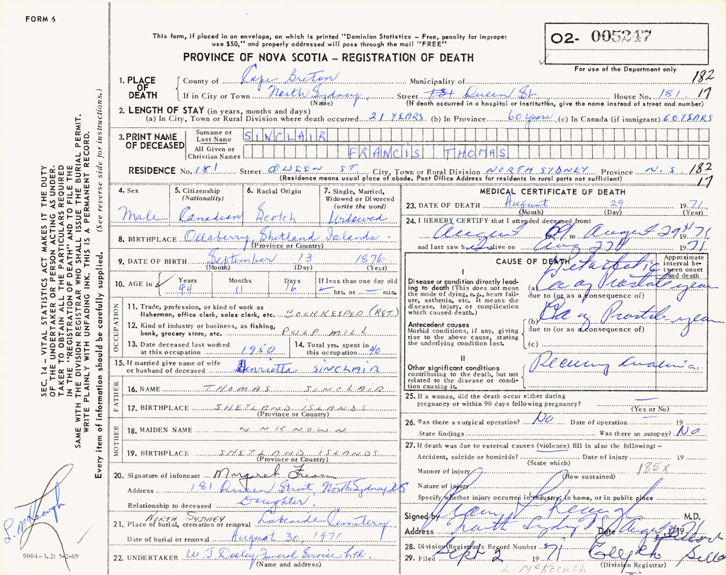PROVINCE OF NOVA SCOTIA — REGISTRATION OF DEATH