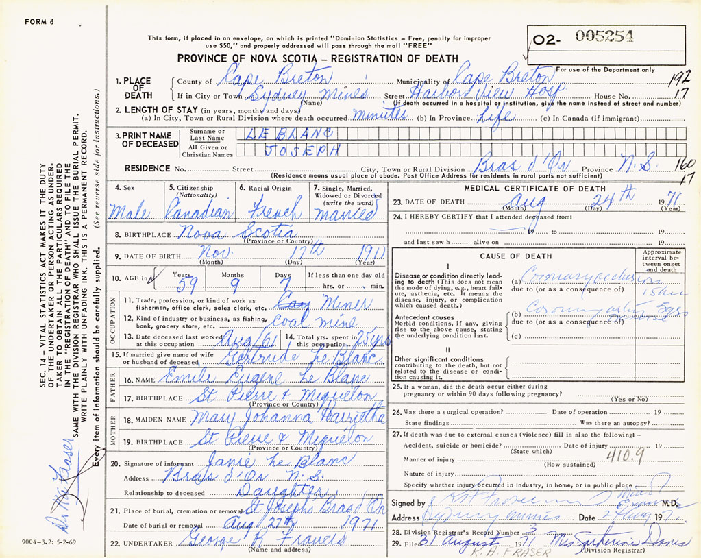 1. PLACE OF DEATH County of Cape Breton If in City or Town Sydney Mines