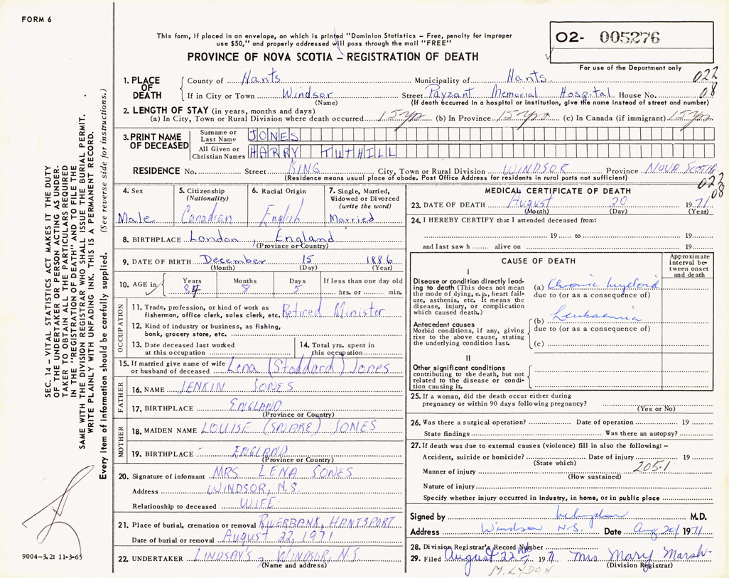 PROVINCE OF NOVA SCOTIA — REGISTRATION OF DEATH
