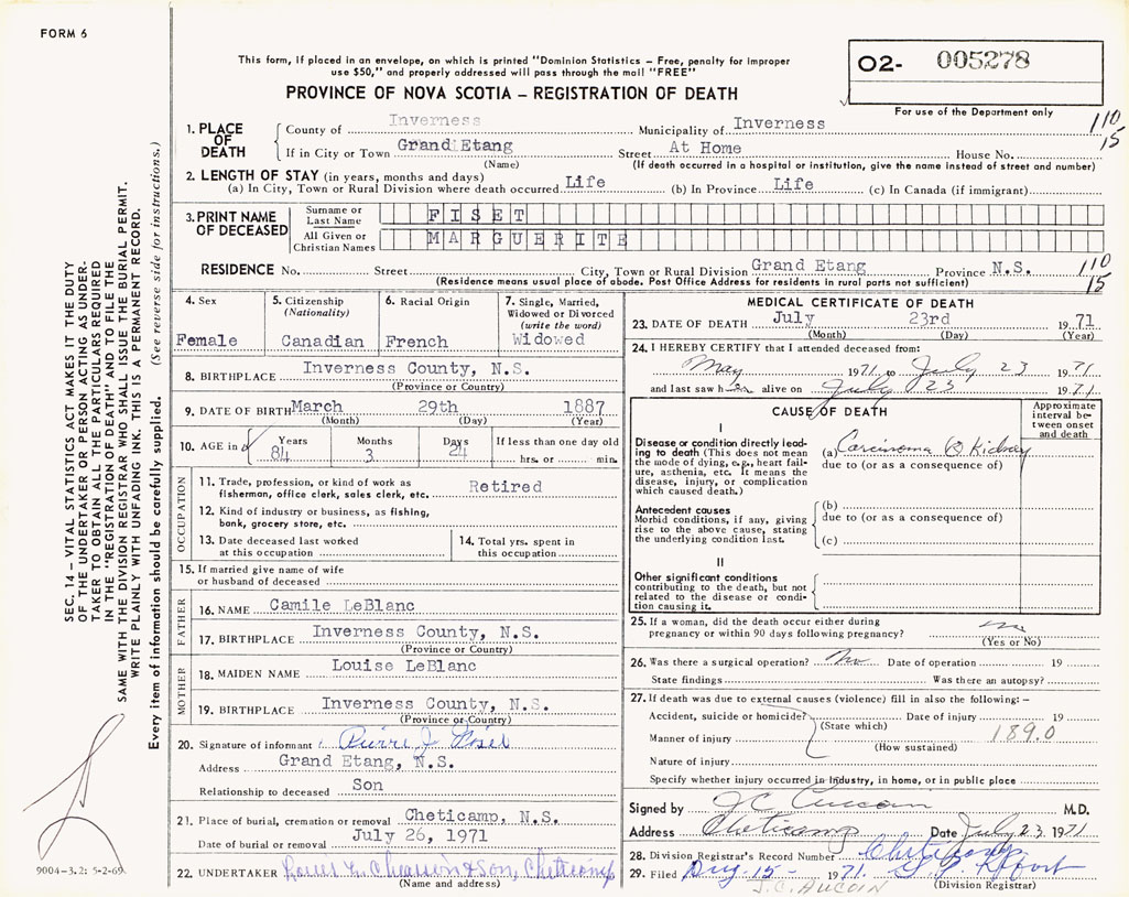 21. Place of burial Cheticamp