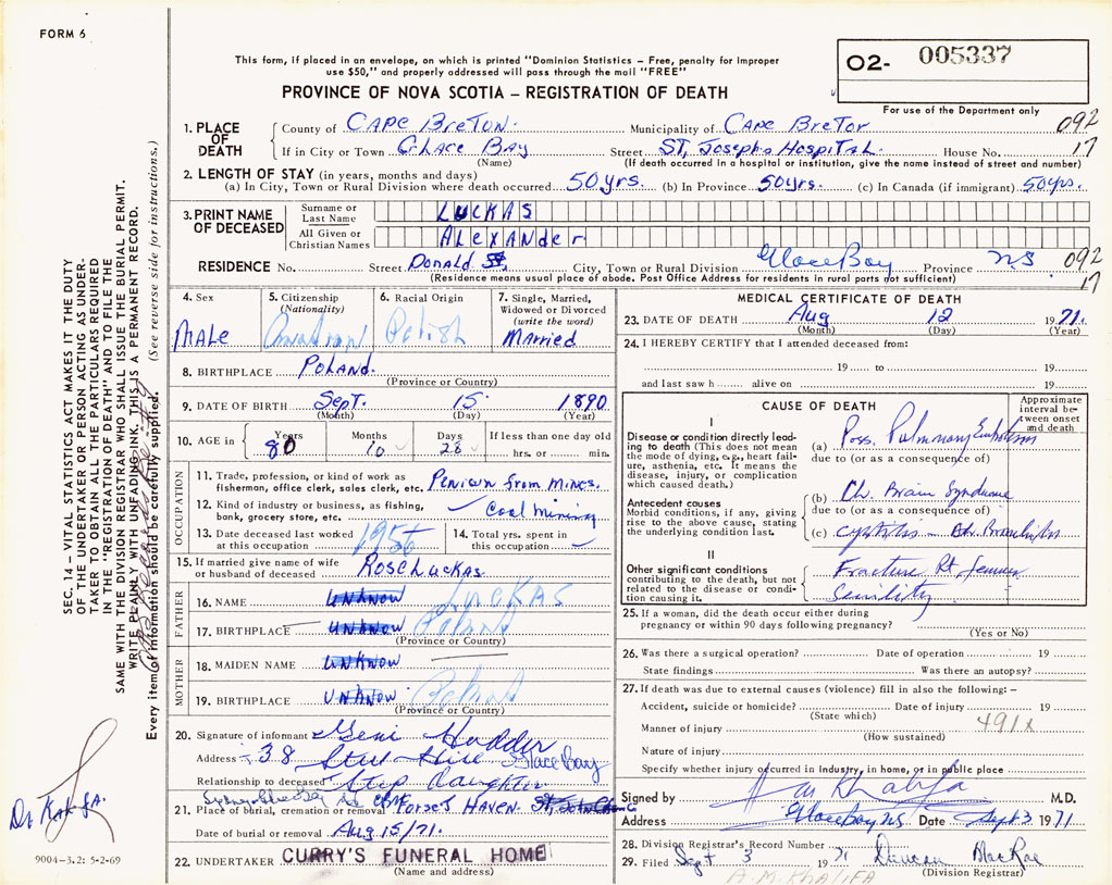 1. PLACE OF DEATH County of Cape Breton If in City or Town Glace Bay