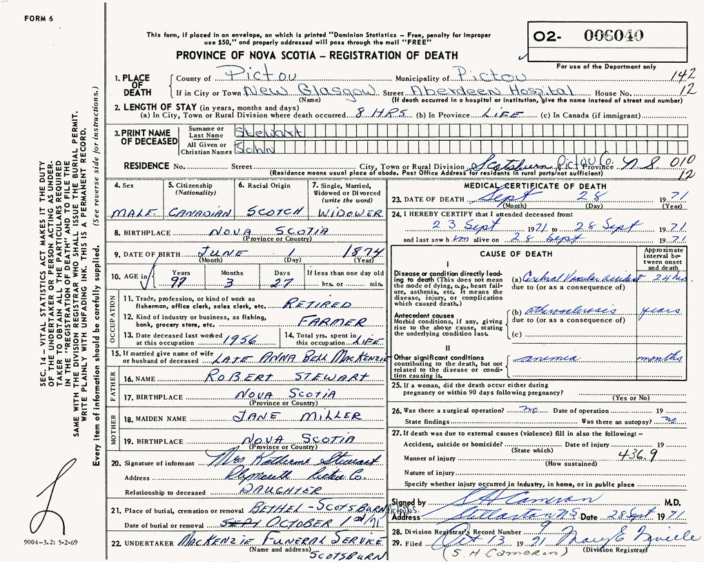 PROVINCE OF NOVA SCOTIA — REGISTRATION OF DEATH