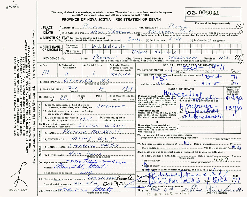 1. PLACE OF DEATH County of Pictou If in City or Town New Glasgow