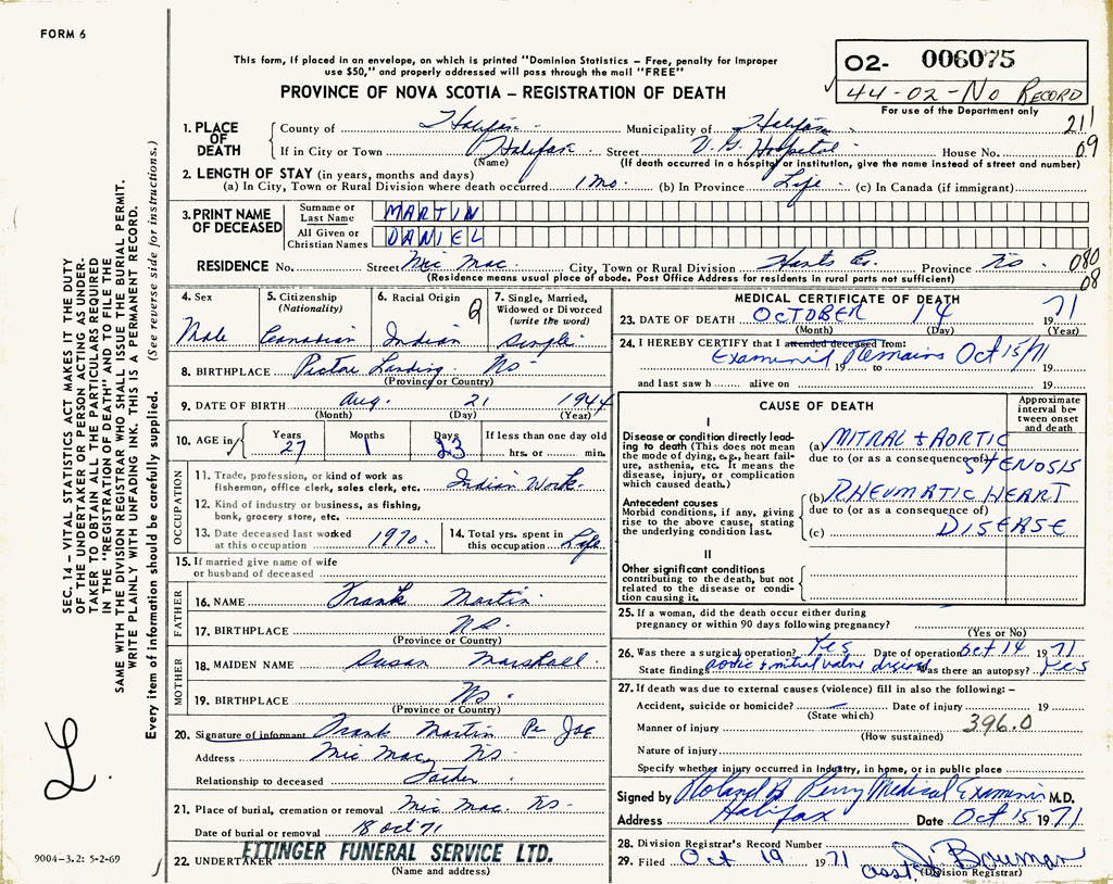 PROVINCE OF NOVA SCOTIA — REGISTRATION OF DEATH