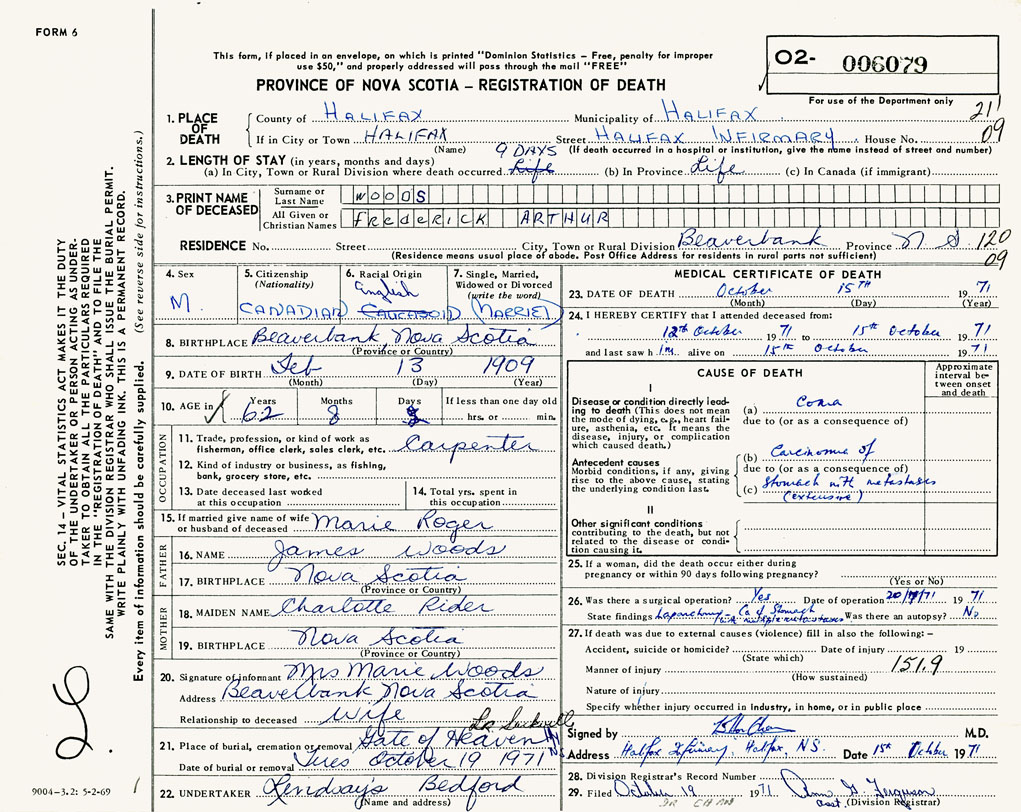 PROVINCE OF NOVA SCOTIA — REGISTRATION OF DEATH