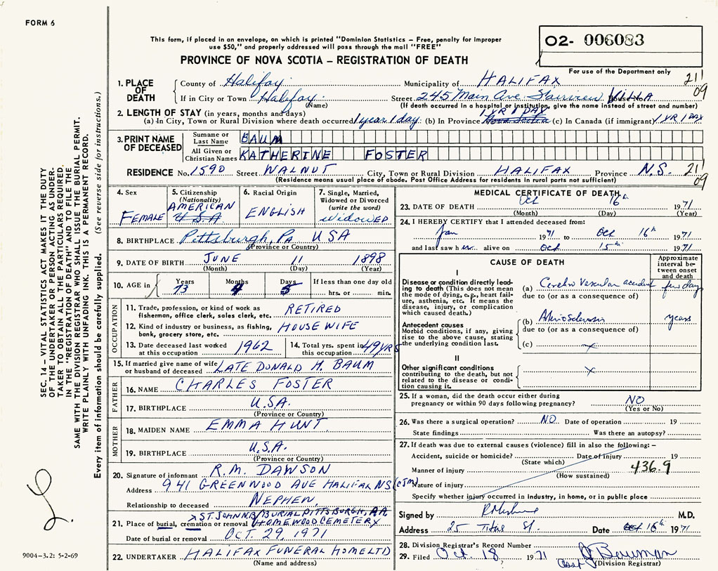 PROVINCE OF NOVA SCOTIA — REGISTRATION OF DEATH