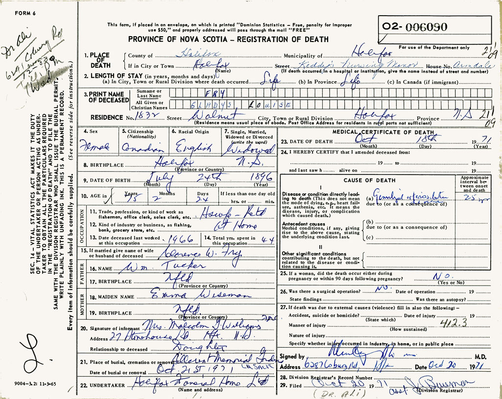 PROVINCE OF NOVA SCOTIA — REGISTRATION OF DEATH