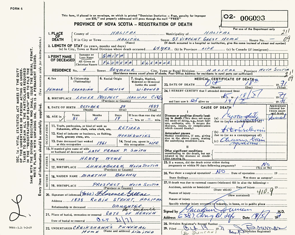 PROVINCE OF NOVA SCOTIA — REGISTRATION OF DEATH