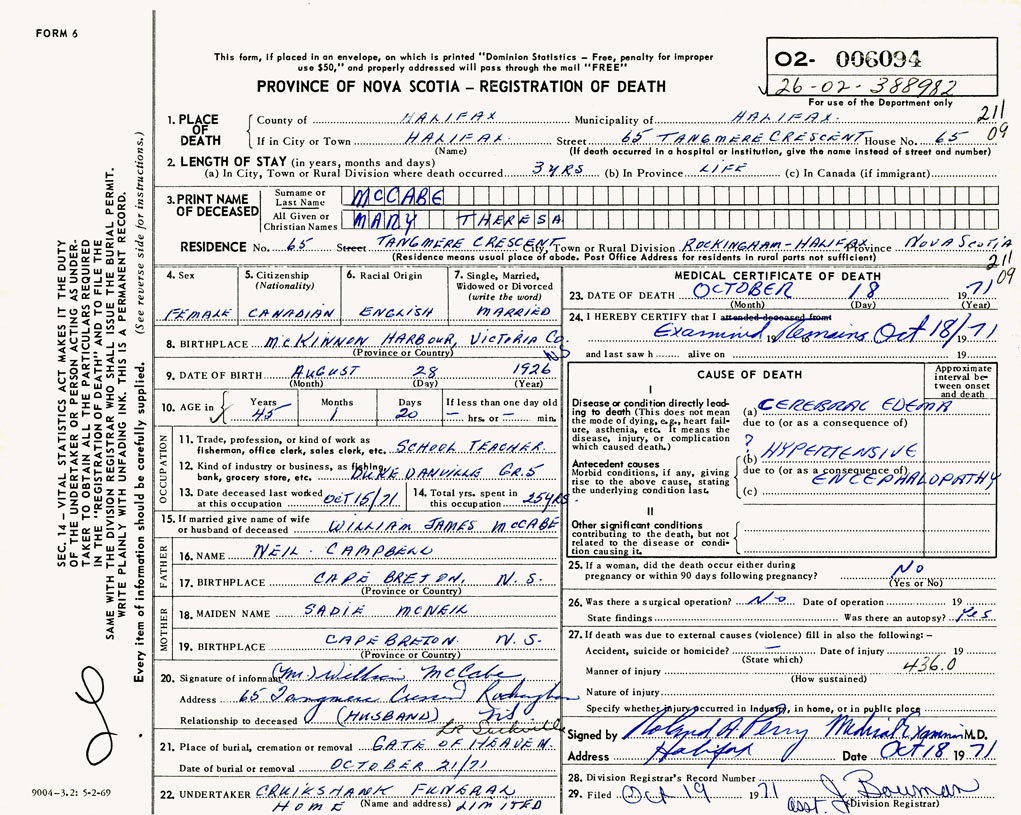 PROVINCE OF NOVA SCOTIA — REGISTRATION OF DEATH