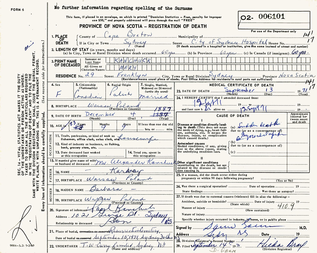 1. PLACE OF DEATH County of Cape Breton If in City or Town Sydney