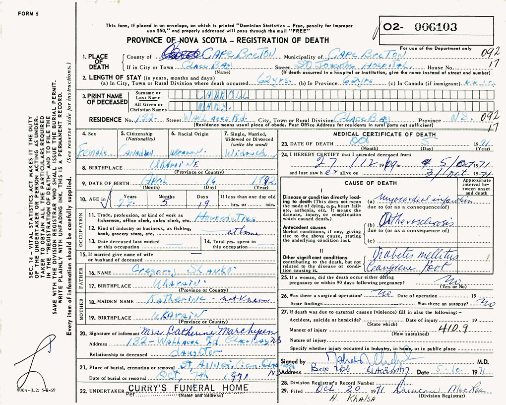 1. PLACE OF DEATH County of Cape Breton If in City or Town Glace Bay