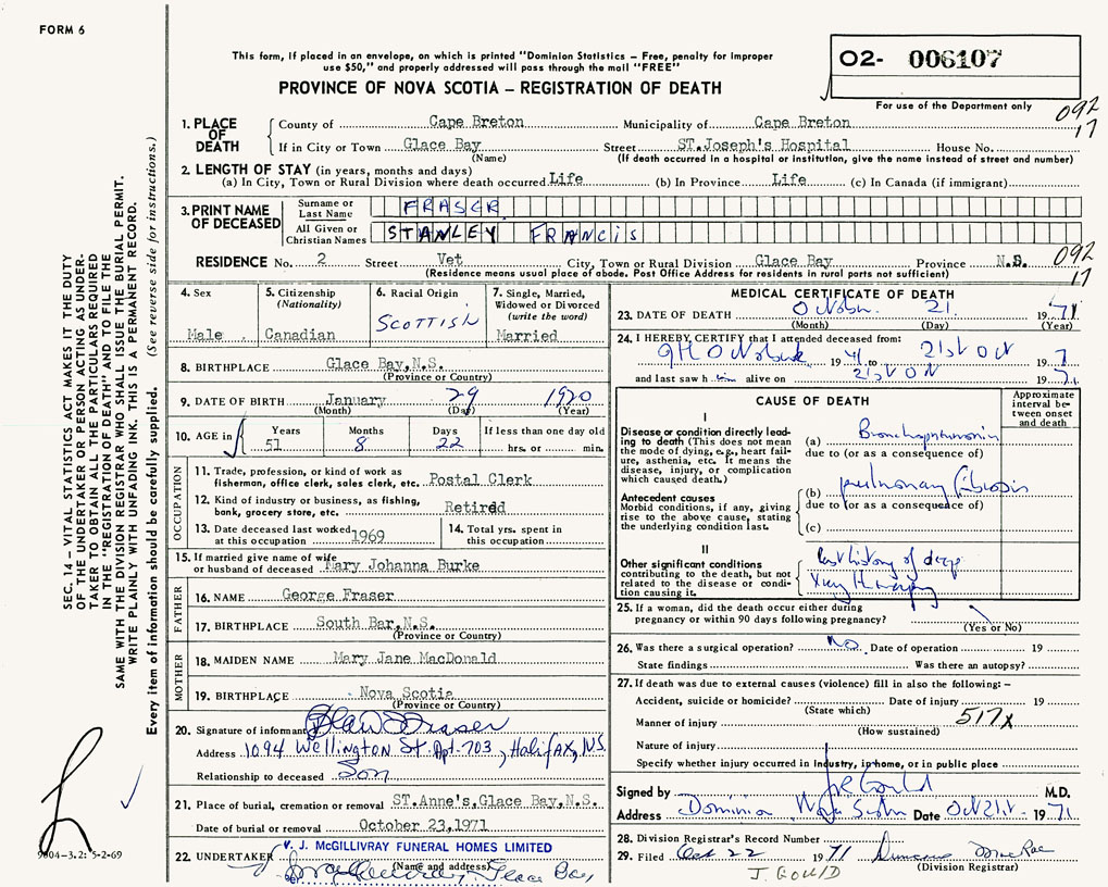 1. PLACE OF DEATH County of Cape Breton If in City or Town Glace Bay