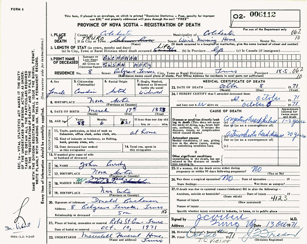 PROVINCE OF NOVA SCOTIA — REGISTRATION OF DEATH