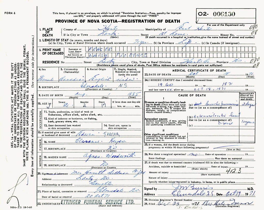 PROVINCE OF NOVA SCOTIA — REGISTRATION OF DEATH
