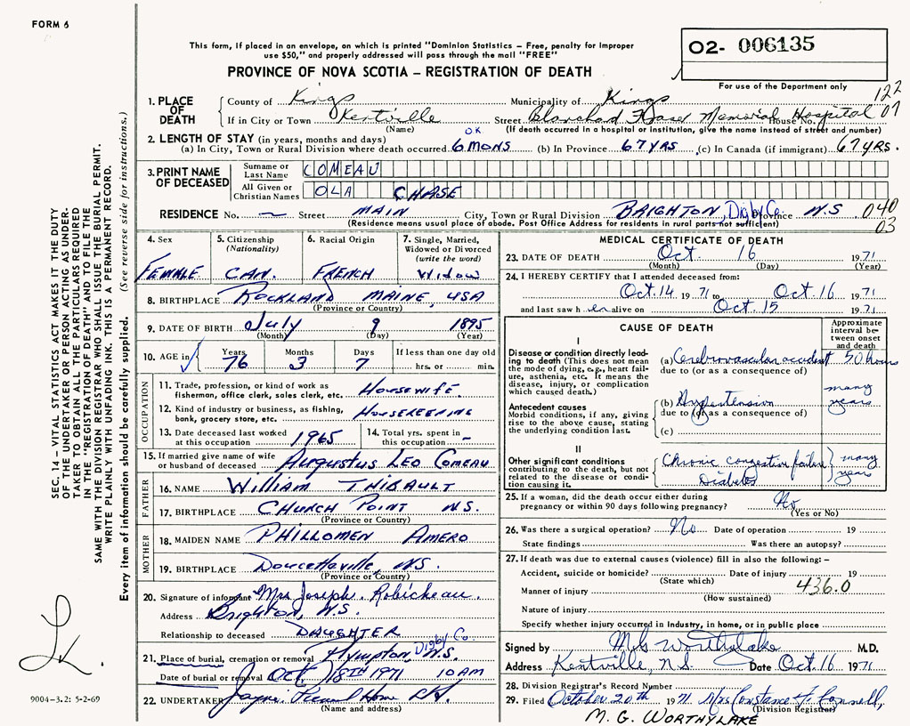 1. PLACE OF DEATH County of Kings If in City or Town Kentville