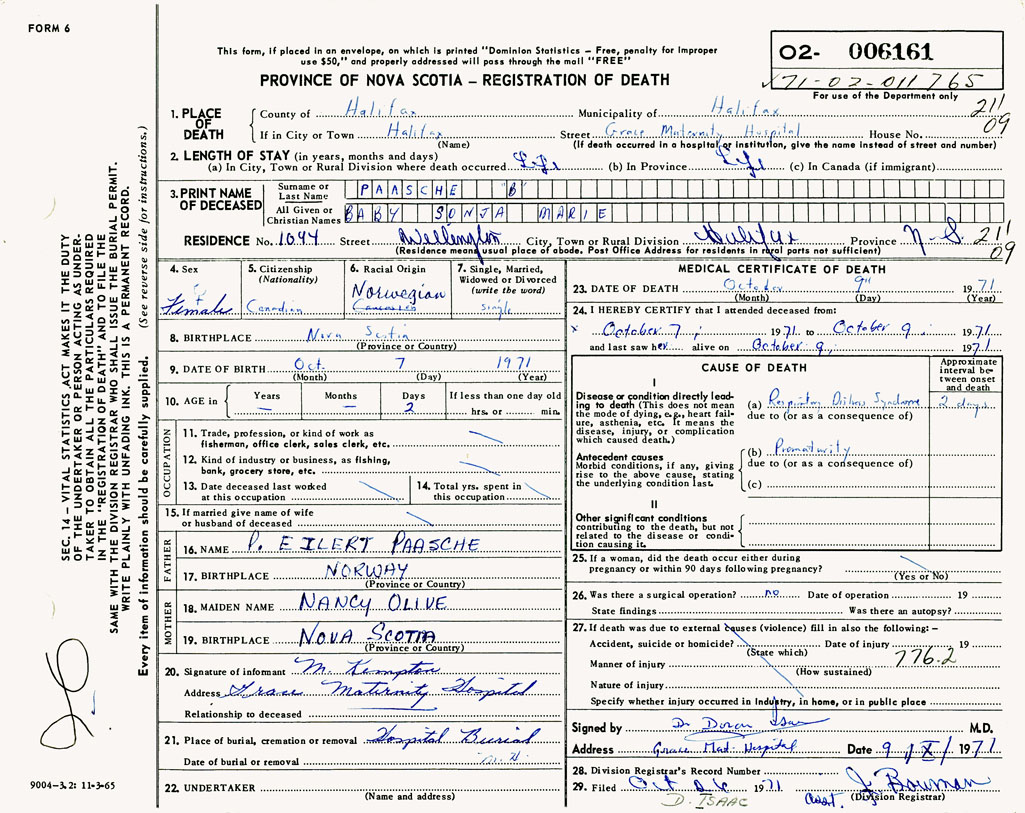 PROVINCE OF NOVA SCOTIA — REGISTRATION OF DEATH