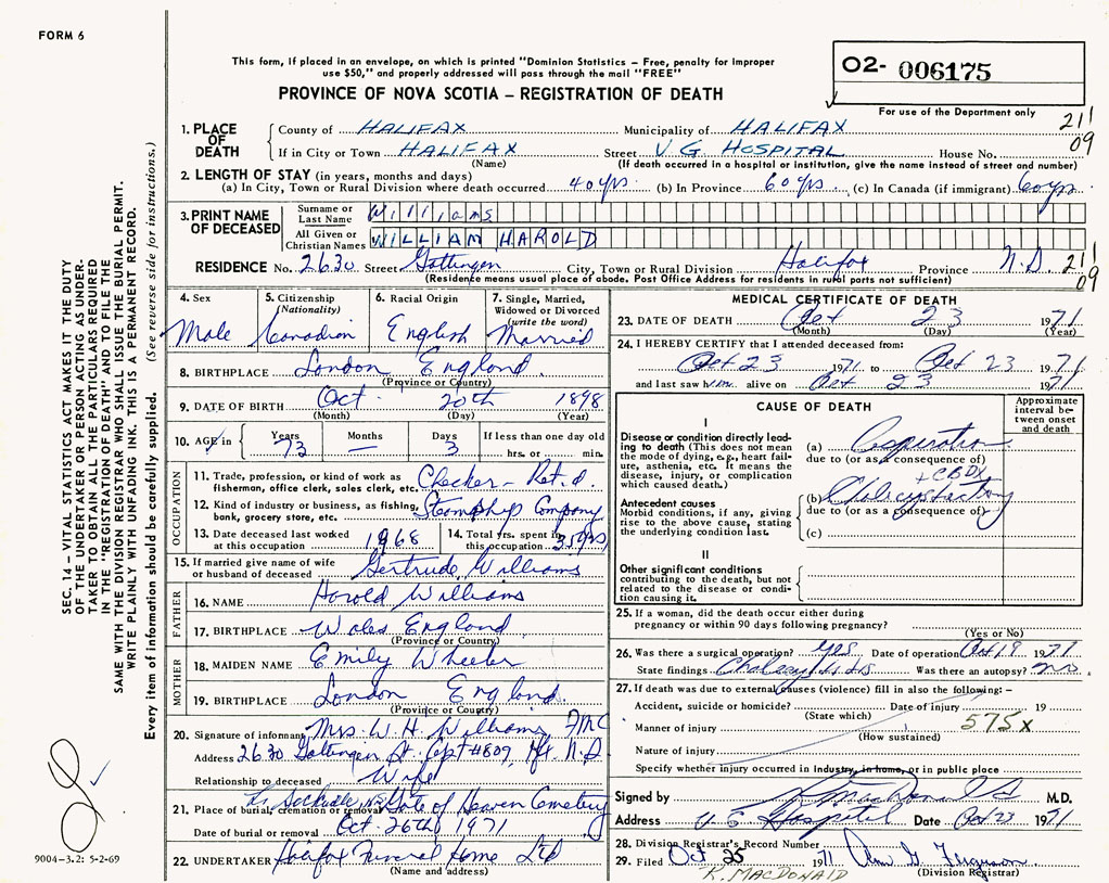 PROVINCE OF NOVA SCOTIA — REGISTRATION OF DEATH
