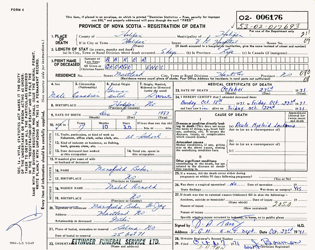 PROVINCE OF NOVA SCOTIA — REGISTRATION OF DEATH