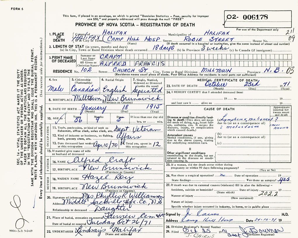 PROVINCE OF NOVA SCOTIA — REGISTRATION OF DEATH