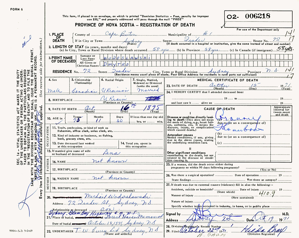 PROVINCE OF NOVA SCOTIA — REGISTRATION OF DEATH
