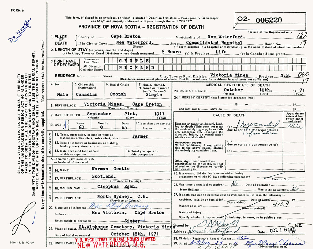 Male Death Registration: Year: 1971 number: 6220