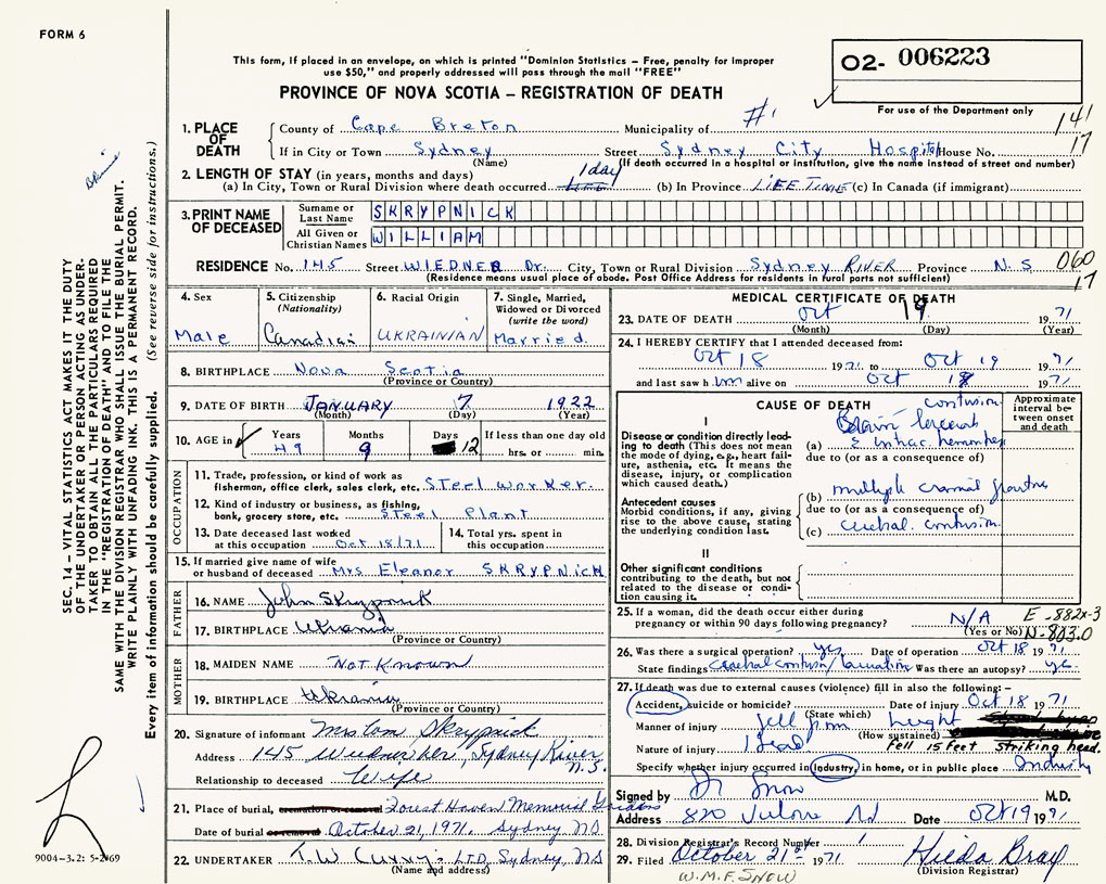 PROVINCE OF NOVA SCOTIA — REGISTRATION OF DEATH