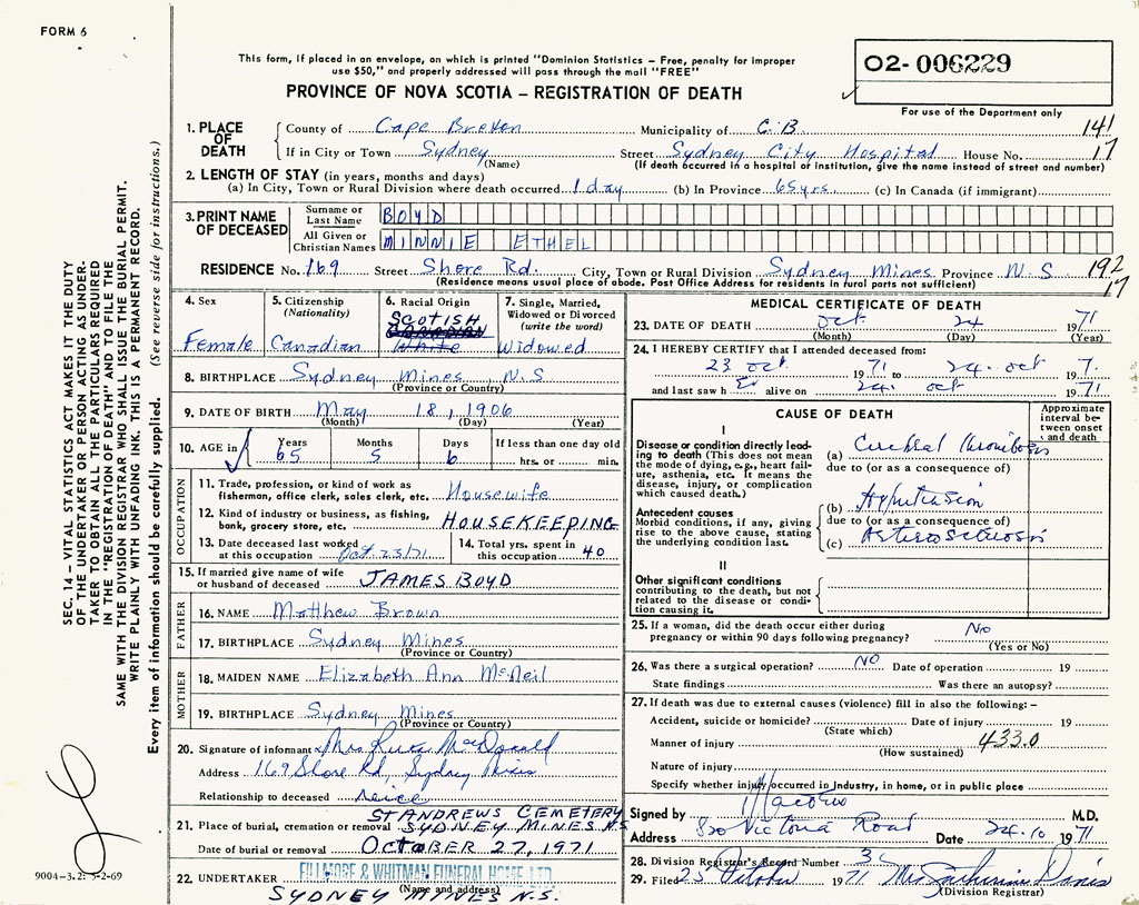 PROVINCE OF NOVA SCOTIA — REGISTRATION OF DEATH