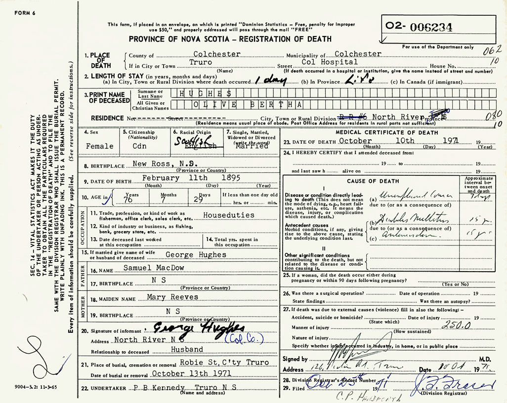 PROVINCE OF NOVA SCOTIA — REGISTRATION OF DEATH