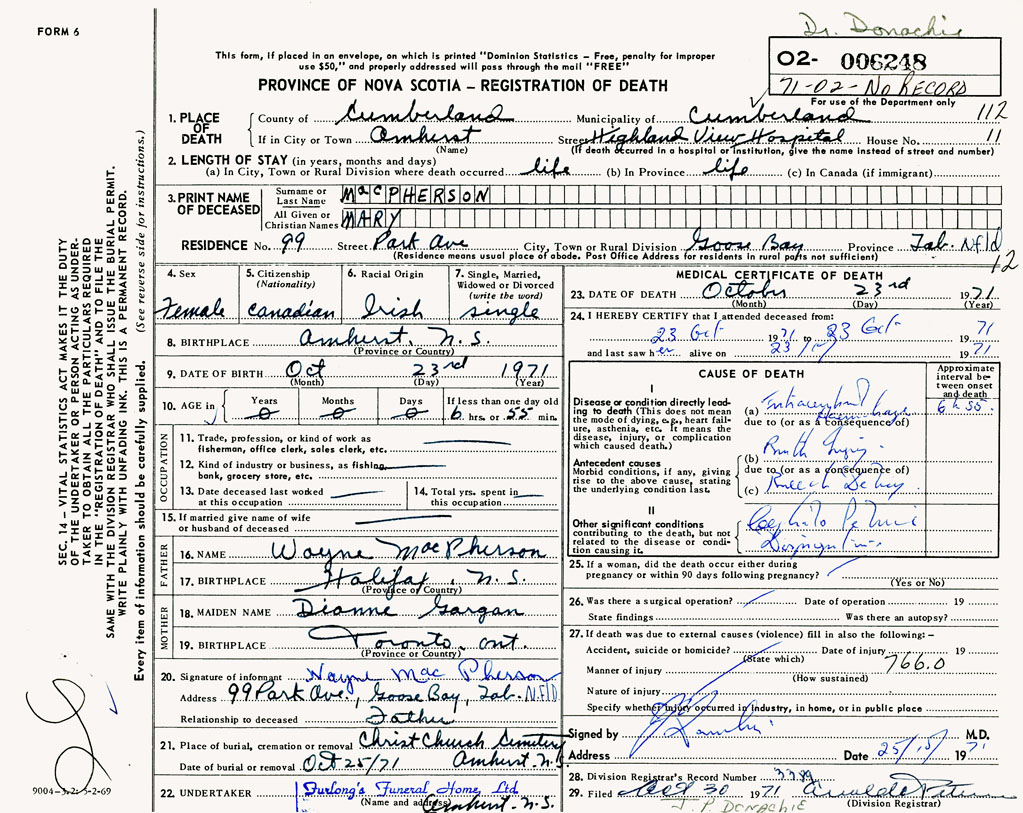 PROVINCE OF NOVA SCOTIA — REGISTRATION OF DEATH