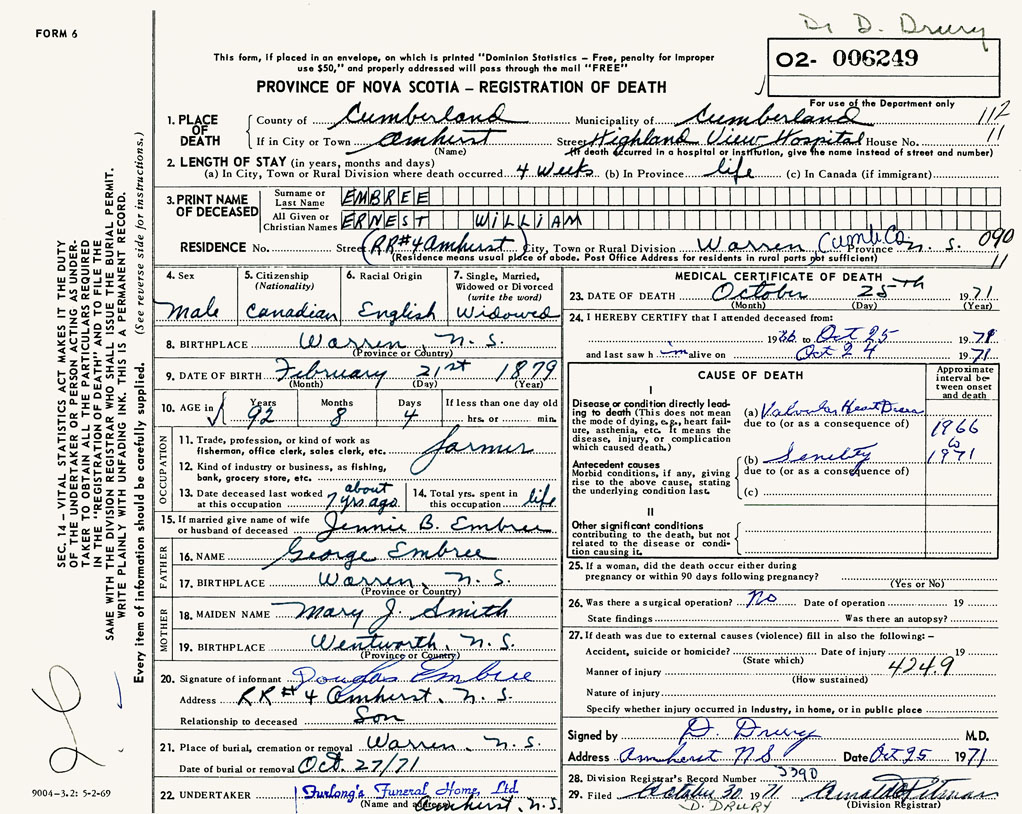PROVINCE OF NOVA SCOTIA — REGISTRATION OF DEATH