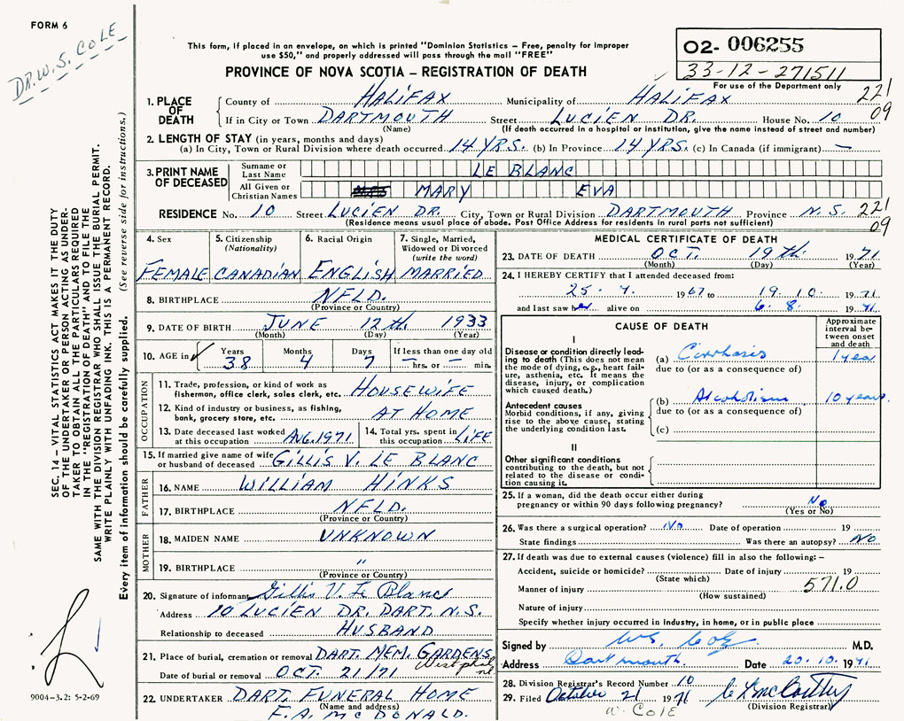 If death occured in a hospital or institution 10 Lucien Dr., Dartmouth