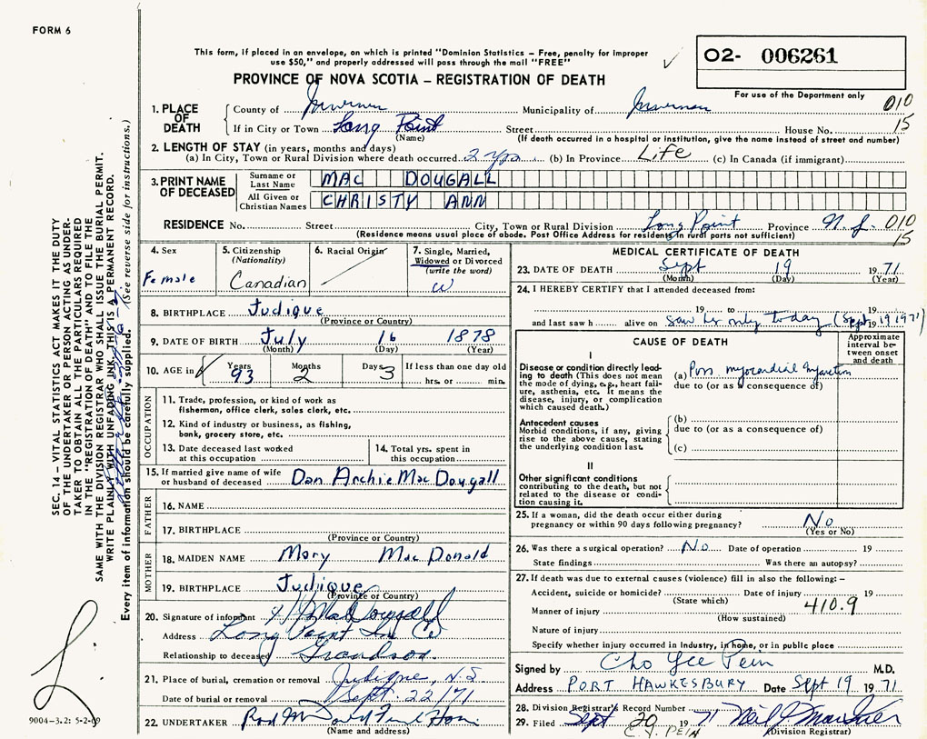 PROVINCE OF NOVA SCOTIA — REGISTRATION OF DEATH