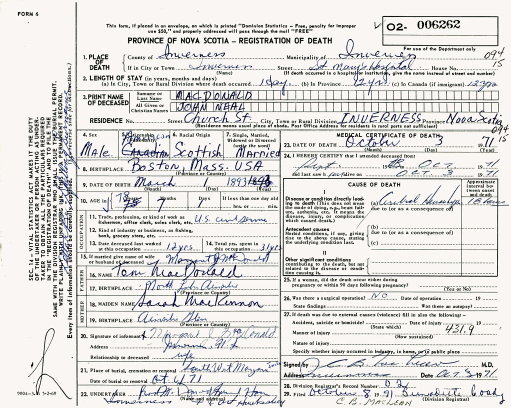 PROVINCE OF NOVA SCOTIA — REGISTRATION OF DEATH