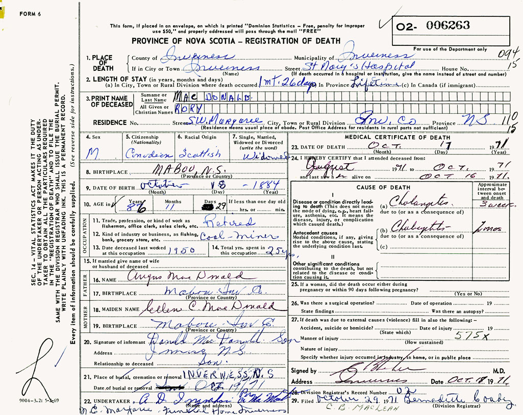 PROVINCE OF NOVA SCOTIA — REGISTRATION OF DEATH