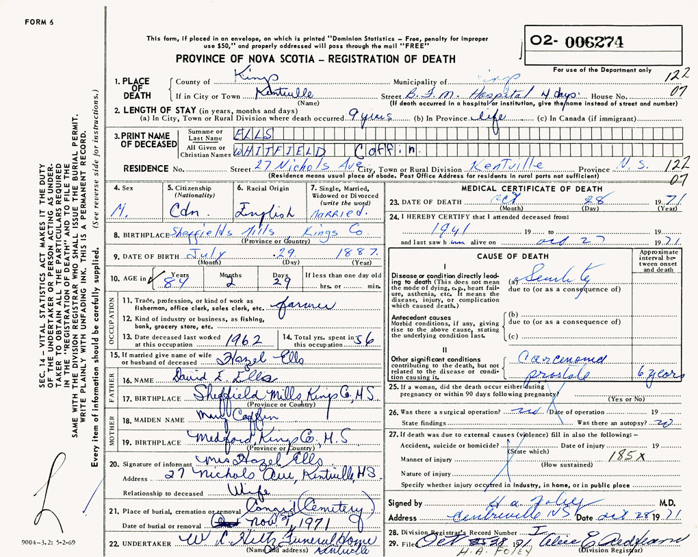 PROVINCE OF NOVA SCOTIA — REGISTRATION OF DEATH