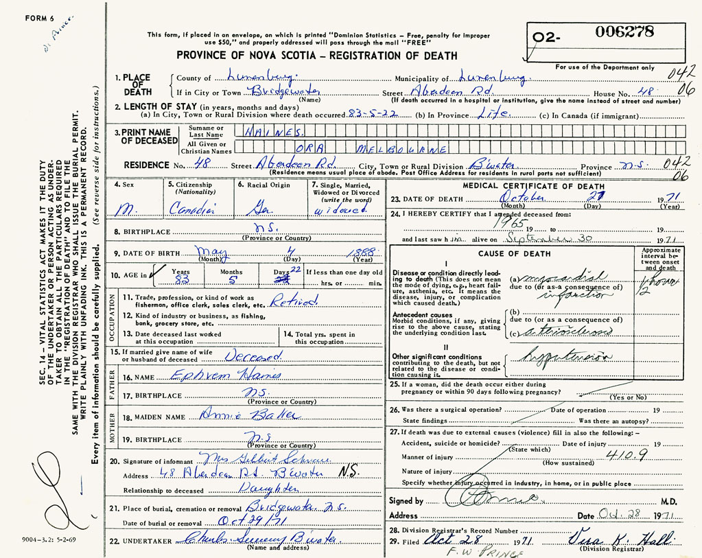 PROVINCE OF NOVA SCOTIA — REGISTRATION OF DEATH