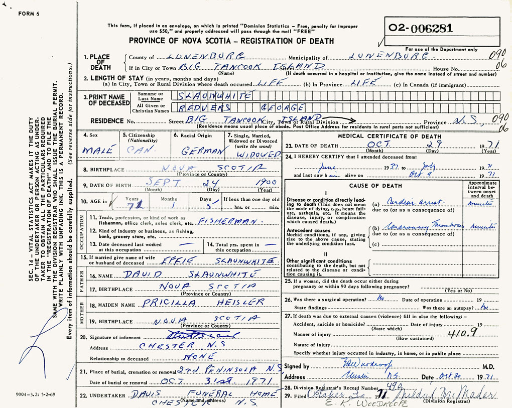 1. PLACE OF DEATH County of Lunenburg If in City or Town Big Tancook Island