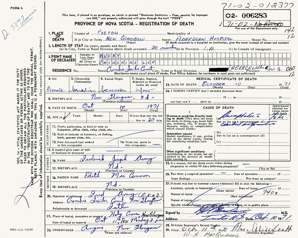 PROVINCE OF NOVA SCOTIA — REGISTRATION OF DEATH