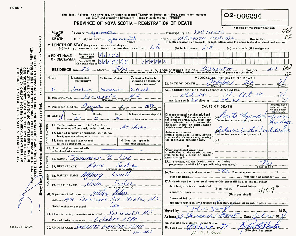 PROVINCE OF NOVA SCOTIA — REGISTRATION OF DEATH