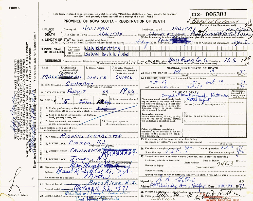 PROVINCE OF NOVA SCOTIA — REGISTRATION OF DEATH