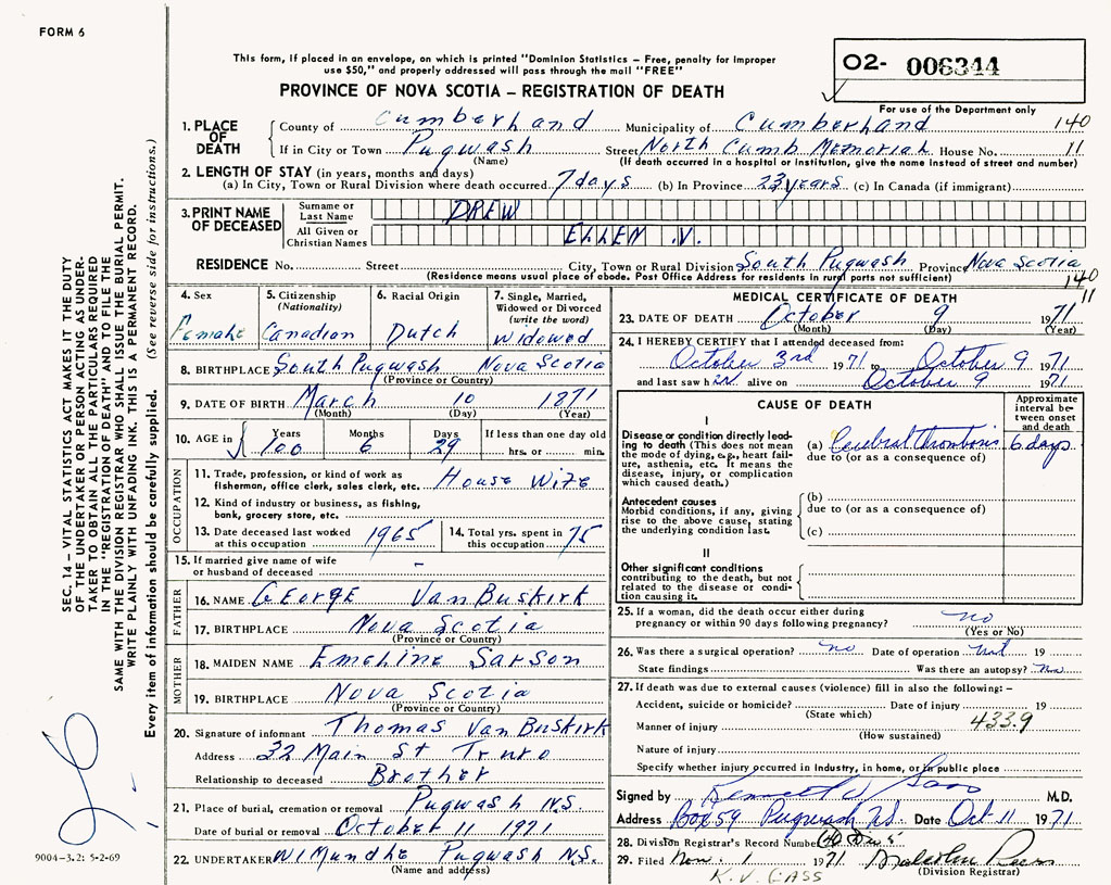 1. PLACE OF DEATH County of Cumberland If in City or Town Pugwash