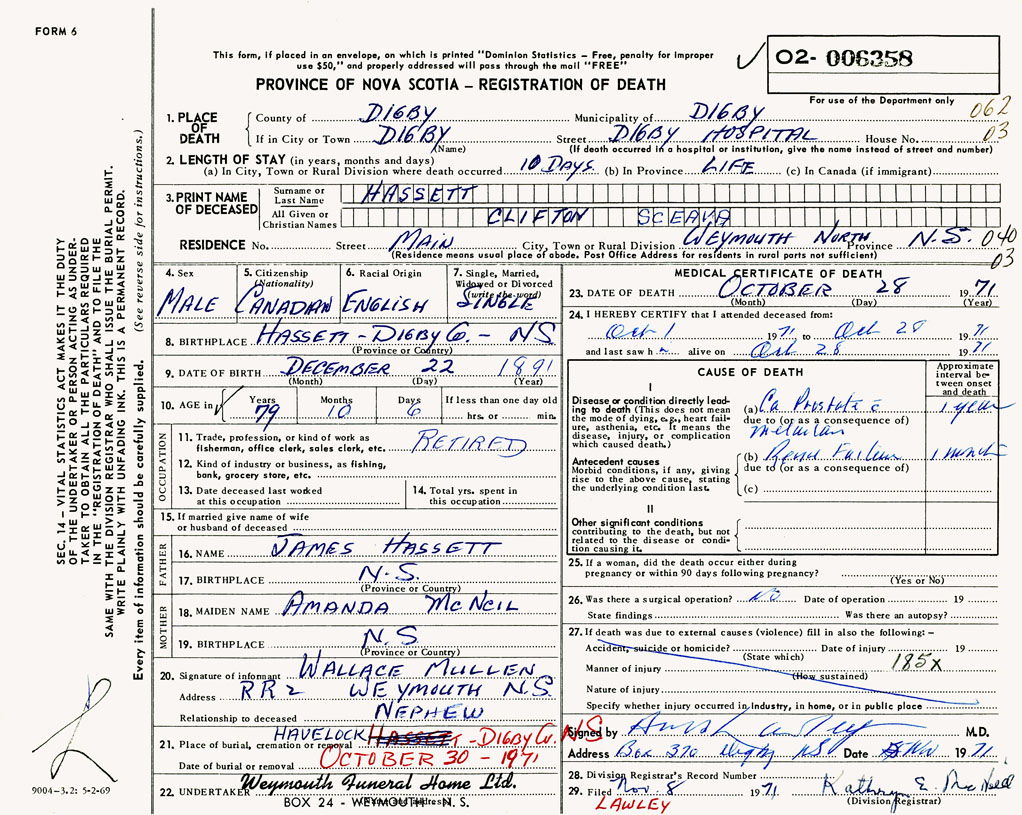 21. Place of burial Havelock, Digby County, Nova Scotia