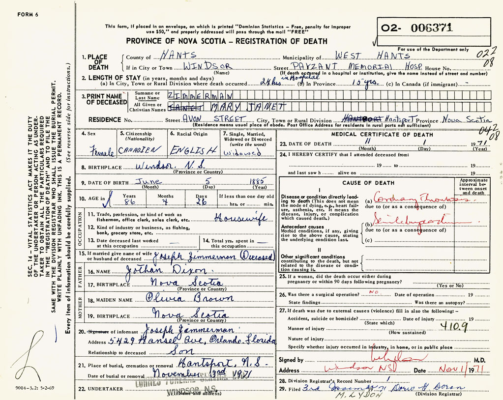 PROVINCE OF NOVA SCOTIA — REGISTRATION OF DEATH