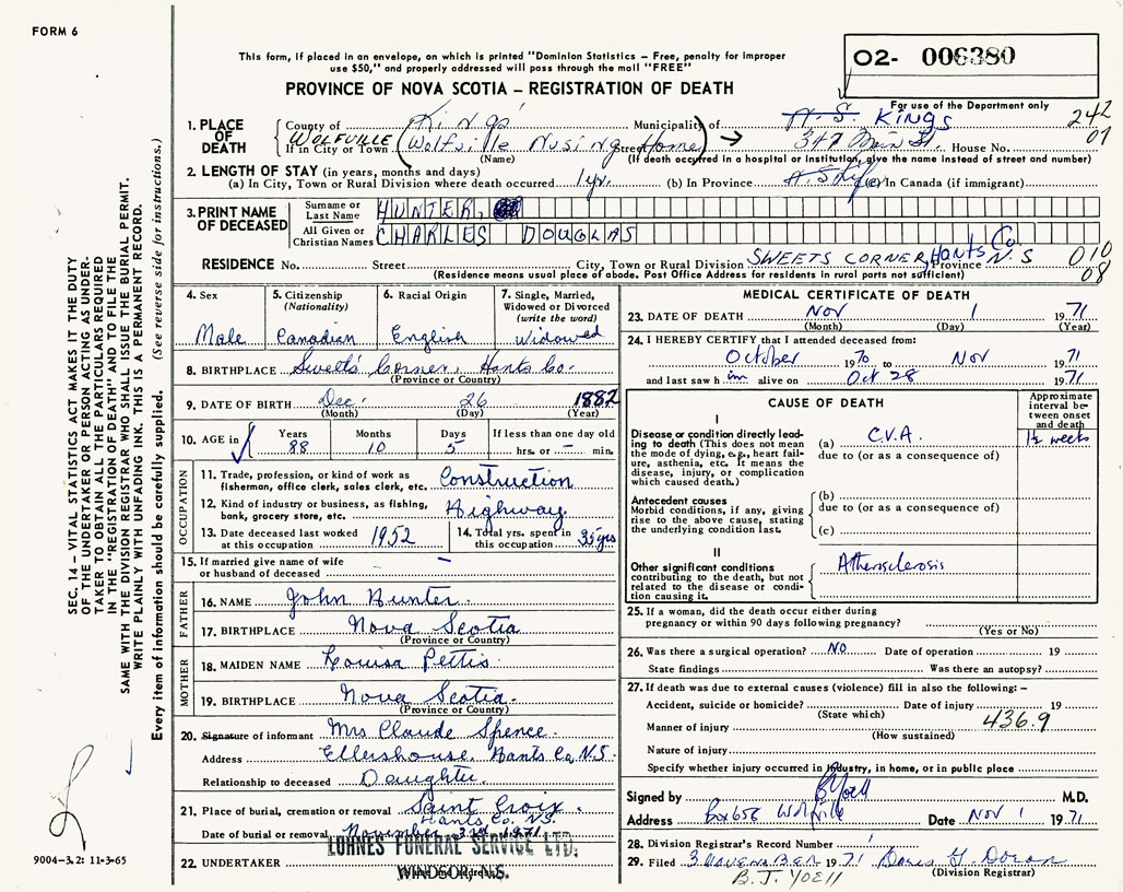 PROVINCE OF NOVA SCOTIA — REGISTRATION OF DEATH