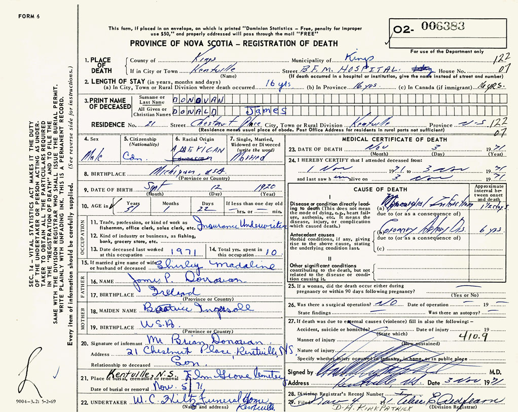 PROVINCE OF NOVA SCOTIA — REGISTRATION OF DEATH