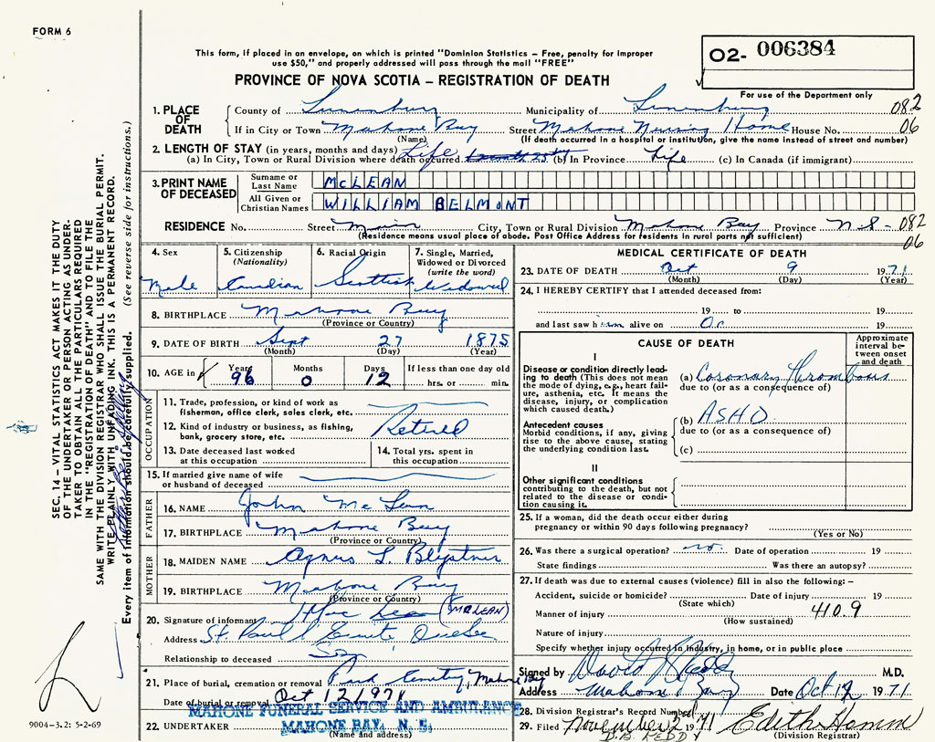 1. PLACE OF DEATH County of Lunenburg If in City or Town Mahone Bay