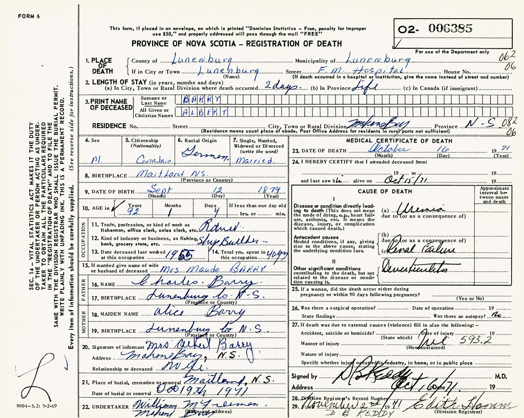PROVINCE OF NOVA SCOTIA — REGISTRATION OF DEATH