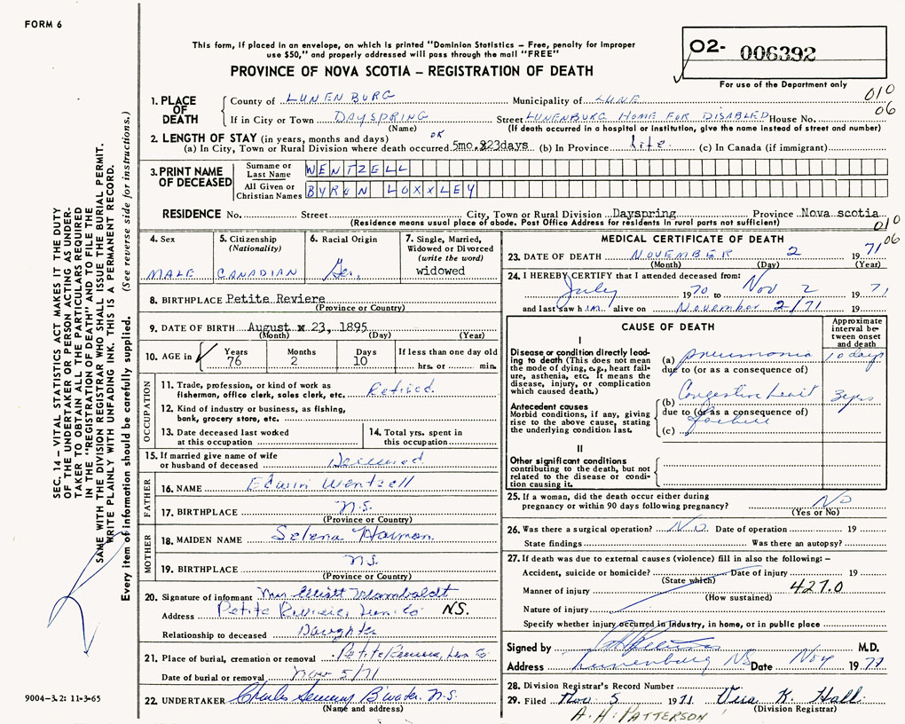 PROVINCE OF NOVA SCOTIA — REGISTRATION OF DEATH