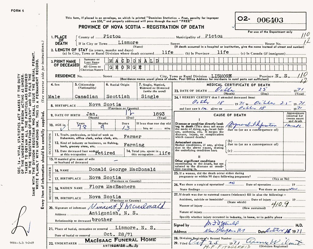 PROVINCE OF NOVA SCOTIA — REGISTRATION OF DEATH